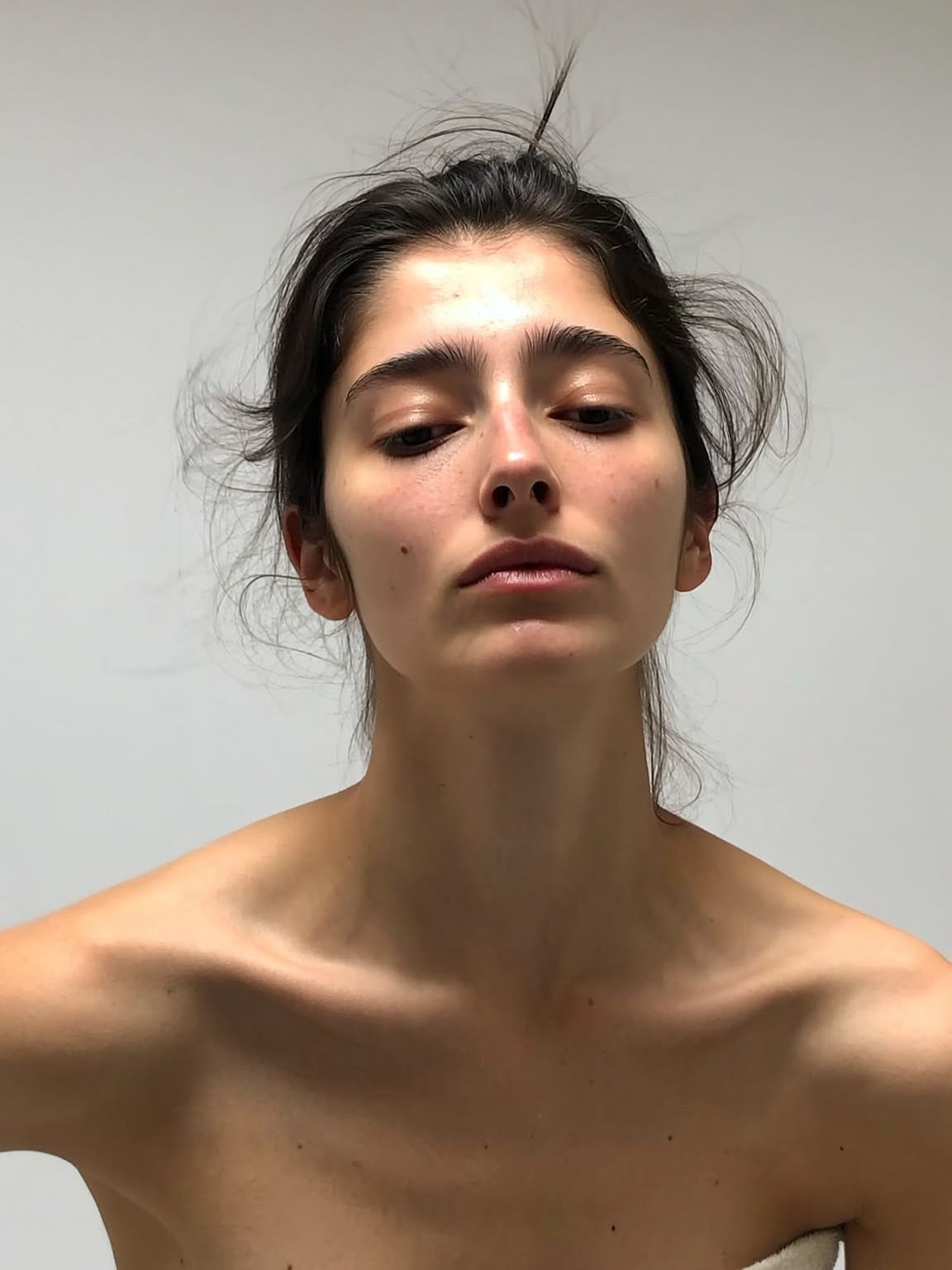A spontaneous front-facing portrait of a young woman with a narrow oval face and long neck, her smooth, light skin showing subtle pores and natural texture. Her almond-shaped eyes gaze downward with a calm, tired expression, lips gently closed, and dark hair loosely tied back with a few flyaway strands softly illuminated. She poses against a plain light gray backdrop, shoulders relaxed, chin lowered, under soft, diffused studio lighting creating gentle shadows and highlights. The image captures authentic skin details and a minimal editorial mood, framed with casual intimacy and natural realism reminiscent of a candid iPhone shot.