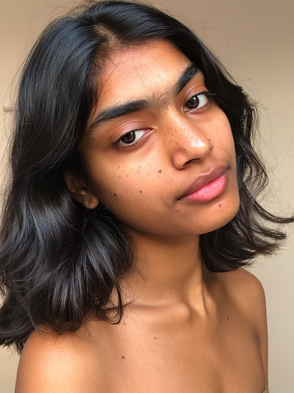 A candid studio portrait of a young Indian woman with an oval face, medium brown skin showing natural freckles, faint pigmentation, and visible pores with micro creases and subtle peach fuzz. Her almond-shaped warm brown eyes engage in direct eye contact with a calm, thoughtful expression; lips are gently closed with soft natural fullness, framed by medium-thick natural brows, and deep black shoulder-length wavy hair with warm undertones softly parted to the side. The background is a plain beige with soft, diffused studio lighting that creates minimal shadows, highlighting the realistic skin texture and subtle nuances of her features. The slight head tilt to the right and relaxed posture contribute to an intimate, spontaneous feel. The casual framing and natural light capture reflect the genuine authenticity of a high-quality iPhone candid portrait.